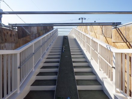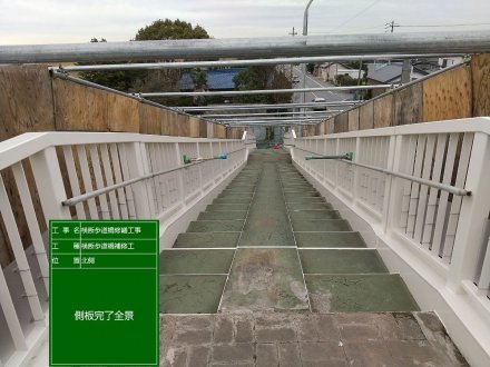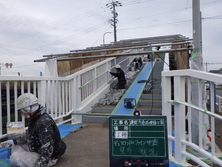 土木部門 2024.03.19公開 横断歩道橋修繕工事 塗装完了 工事概要 発注者 西尾市 工事名 横断歩道橋修繕工事 工事場所 西尾市新村町外1町地内 新村歩道橋 工事期間 令和5年6月〜令和6年2月 工事内容 道路付属施設工、維持修繕工、その他土木一式工 着手前 足場設置① 足場設置② 吊り足場設置 落下物防護板 設置 FRPシート 張り付け FRPシート 紫外線照射 FRPシート 完了 ケレン状況 ジンクリッチ塗布 夜間照明① 夜間照明② 中塗り塗装① 中塗り塗装② 塗装完了 側板設置 側板完了全景